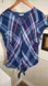 Chic plaid blouse with a tie-front. Ideal for casual wear. Features navy and pink tones.