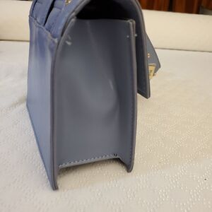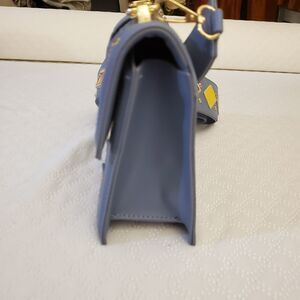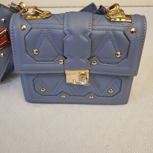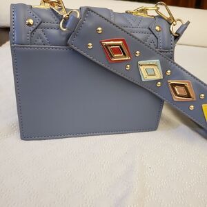 Beautiful Blue Purse with gray undertone. Golden studs and multi colored accented belted shoulder strap. It's new without tags. Please refer to pictures for best description condition verification, and measurements.