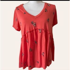 Blue Rain coral embroidered butterfly floral v neck babydoll medium top
