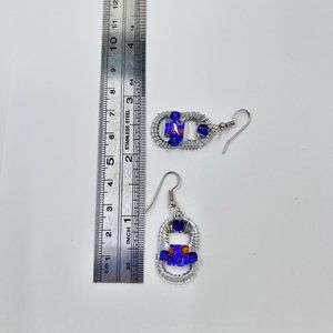 Blue/Red Millefiori Glass Beaded Silver Tone Wire Wrapped Pop Tab Fishhook Earrings. Earrings are 1.75” in total length by 5/8” wide. Earrings are previously loved and are in great condition.