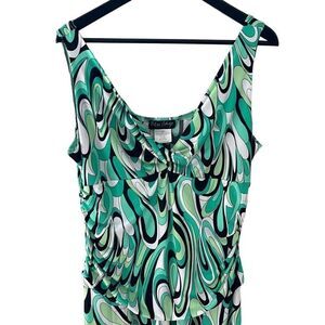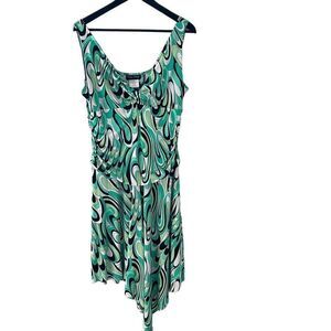 Blue Sage Womens Asymmetric Dress Fit & Flare Abstract V Neck Stretch Green Size XL Ruched Side Hi Low Hem Midi Length Sleeveless Summer Party Bohemian.