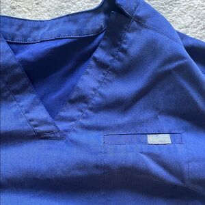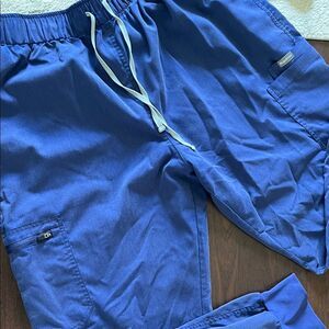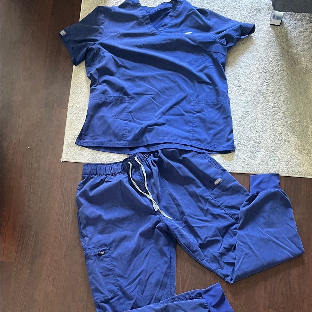 Comfortable blue scrub set with top and pants. Ideal for medical professionals. Fits like a large