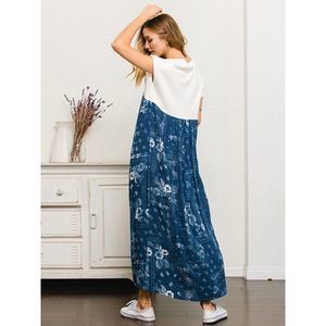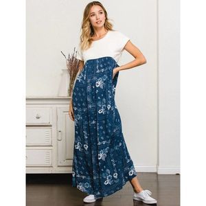 Blue Short Sleeve Floral Colorblock Maxi Dress