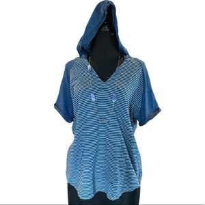 Denim style blue and white stripe hoodie top. Hoodie has front pockets. Gently worn and in excellent condition.
