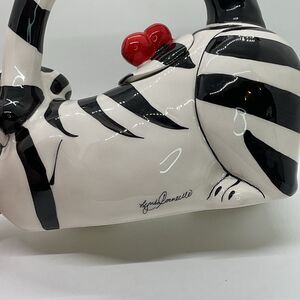 Charming teapot featuring a black and white striped cat with a colorful parrot accent. Perfect for adding a whimsical touch to your kitchen decor. No chips or cracks. Signed.