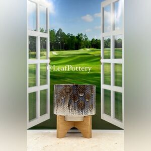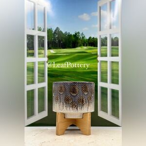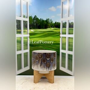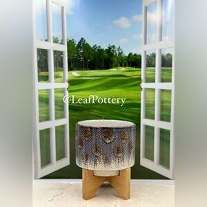 Dimensions: 6.25”H x 5.25”W, Opening 4.9”, weight 1lbs 10.9oz, No Drainage hole, Type: Barrel with wood stand, Color: Blue, Brown & Beige , Materials: Ceramic & Wood, Made in China, perfect for Indoor/Outdoor gardening, Don’t to dress up your plants 🪴