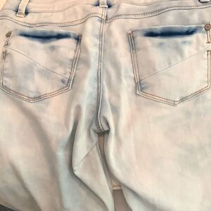 These Blue Spice pre-loved jeans are like blue with medium blue accents around zipper, down the side of legs and back pockets. Straight leg. Belt loops. Washed out finish. Some stretch to fabric. Short zipper with double button closure. Waist flat across is 16”. Hips flat across is 20”. Inseam is 31”.
