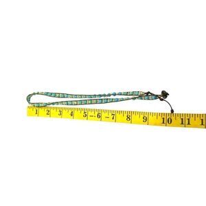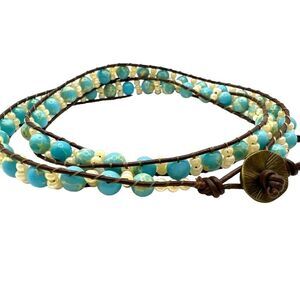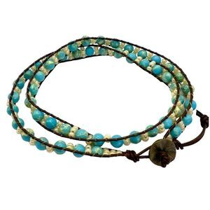 Blue Turquoise White Beads Brown Leather Wrap Bracelet 18" in very good condition.