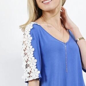 Blue V-Neck Floral Crochet Shoulder Tunic. A beautiful rich blue tunic with white floral crochet on the shoulders.