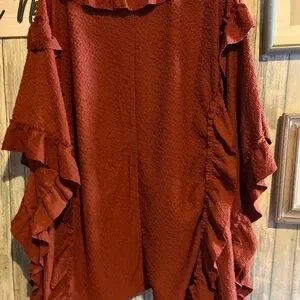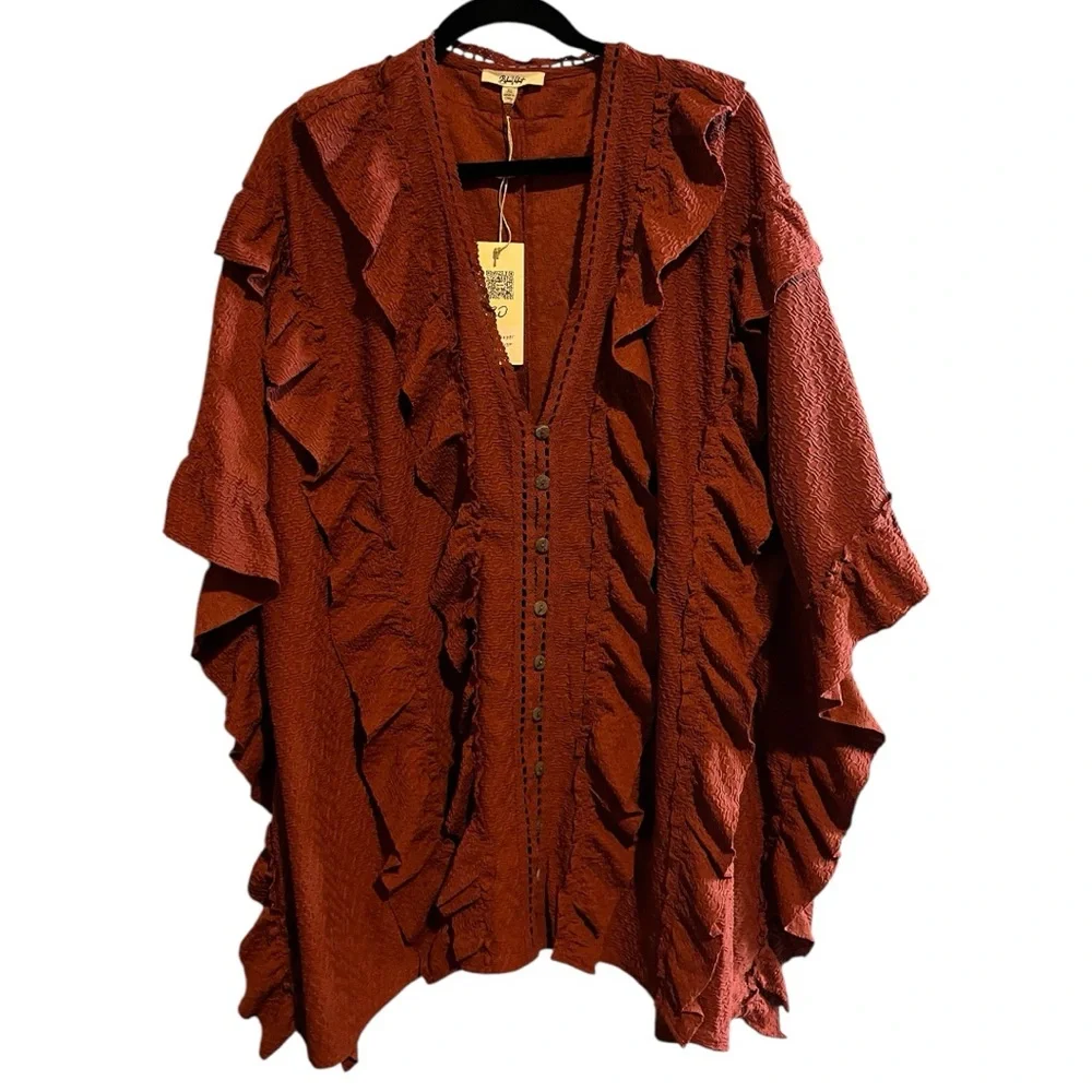 Stylish and gorgeous rust-colored button down with ruffled details. Interesting texture and vibrant color make this a wardrobe must. Perfect for layering.