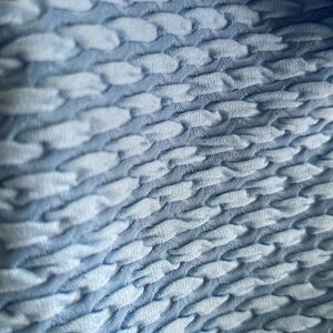 Pretty blue top has a raised weaved design. 3/4 sleeves. Soft stitching around neckline. V-neck. Can be worn by pre-teen or petite adult. Please see measurements. Underarm flat across is 16”. Length is 20”. Sleeve length is 13”. Great condition.