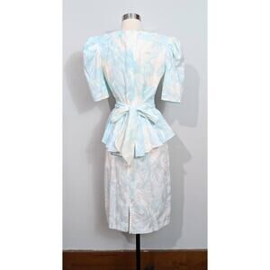 The blue design is so light and reminds me of watercolor. It could not be more 80s if it tried, between that watercolor print, the peplum and back tie, and the shoulder pads! It's so lovely and spring!