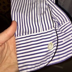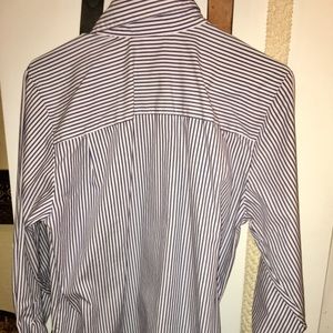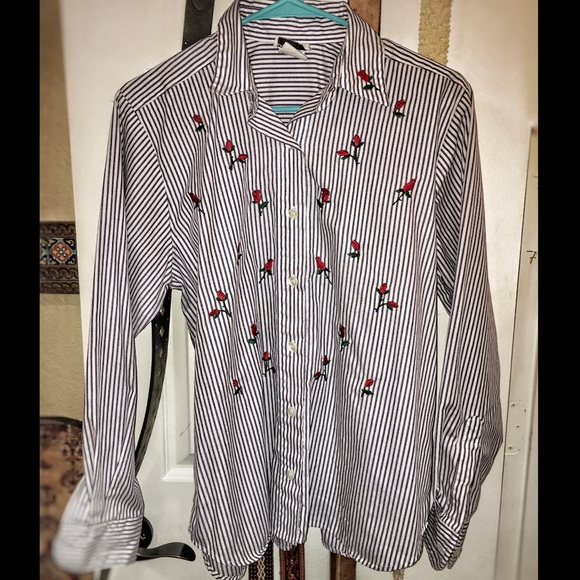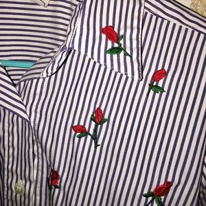 Description: Navy blue and white stripped button down shirt with red roses embroidered all over it. Very comfortable and breathable! Great for the office or a nice spring day 😊