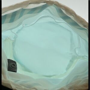 Waterproof polyester fabric, drawstring close, interior storage w/zipper pocket pouch. Also, they fold flat. Cutest bag ever & holds a lot. Measures 9.5” x 9.5”.