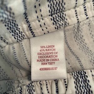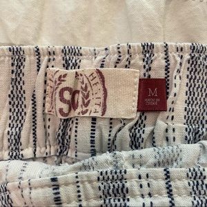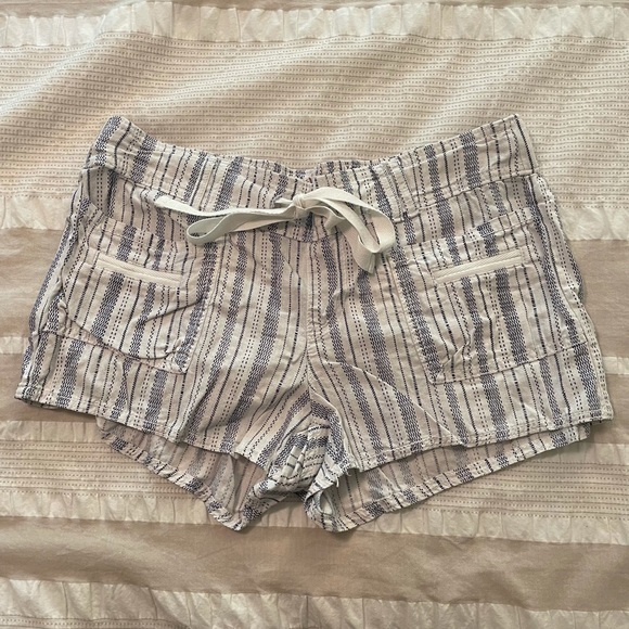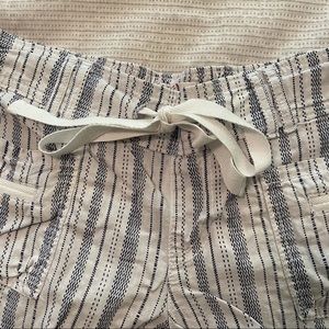 Waist can be tightened with drawstring. White shorts with dark blue patterns. PLEASE IRON ME :( I’ve been sitting in a drawer neglected for a while!!!