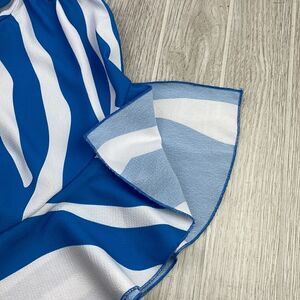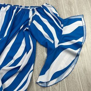 Blue & White Striped Off the Shoulder 3/4 Flare Sleeve Tie Knot Blouse. 2XL. Polyester/Spandex Blend. Lightweight and so cute on. Excellent preowned condition. Pit to Pit and length measurements are shown in pics.