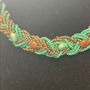 This stunning necklace features a unique braided design, combining blue and brown hues for a striking contrast. The intricate weaving technique creates a dimensional texture, making it a versatile piece for any occasion. Its consistent width and elegant pattern ensure a cohesive and eye-catching look.
