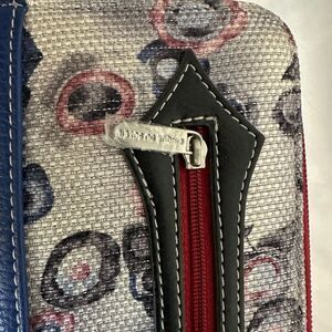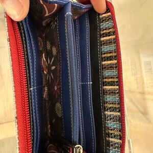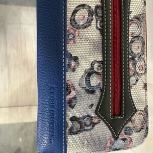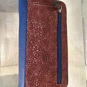 Stylish blue and red clutch by Carlo Rino, perfect for any occasion. Features a unique design with a convenient wristlet strap.