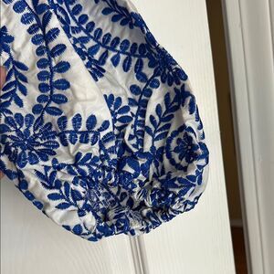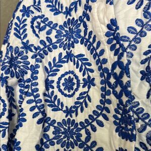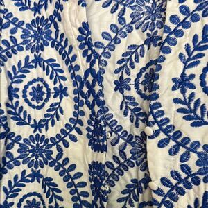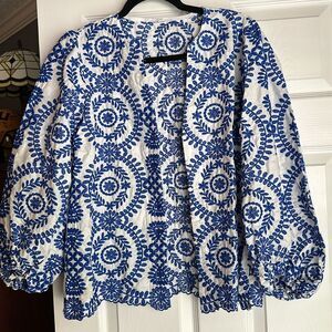 Stylish jacket with intricate blue embroidery on a white background. Perfect for adding a touch of elegance to any outfit.