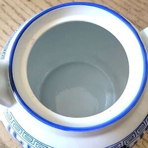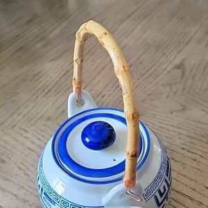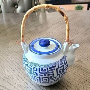 Blue and white porcelain teapot rattan handle with strainer NWT