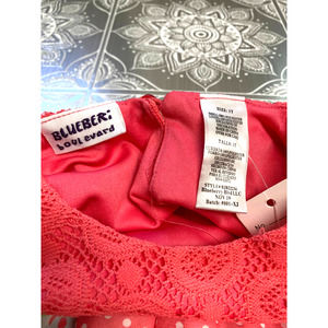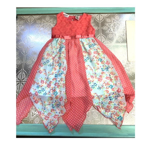 Blueberi Blvd pretty dress size 3T. Crochet Bodice in deep peach with Pretty floral and polka dot skirt with satin bow at waist, Bodice s lined in peach and there is an underskirt in white. 24" from shoulder to hem. From Blueberry Blvd LLc. style BJB22234