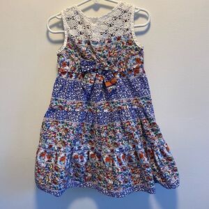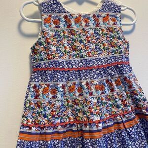 Vibrant and fun all over prints with alternating floral fabrics throughout. Buttons in back for closure with a bow tie detail on back. Fit & flare, sleeveless, crochet style detail on back paneling, meant to fall below the knee. Great gently used condition with no notable flaws.