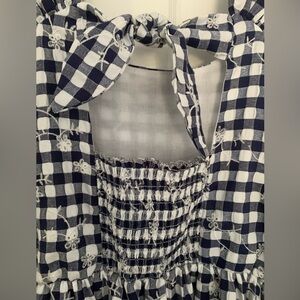 Charming maxi sundress featuring a classic navy and white gingham pattern, back smocking, fully lined and bow detail. Measurements in photos.
