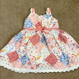 Adorable patchwork dress with floral patterns. Halter top style in front. Cute Lacey hem and straps. Features pink and blue tones. Ideal for casual outings.
