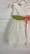 Charming white dress with a textured design. Green sash with a pink flower accent. Perfect for special occasions.