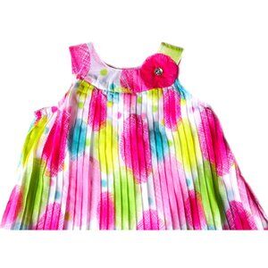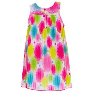 The sleeveless empire design features wide straps and a cheerful watercolor print splashed with vibrant shades of hot pink, teal, lime green, and sunny yellow — like a little painting come to life!
