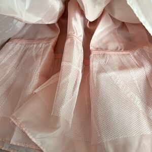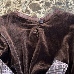 Beautiful with Ruched ruffle trim on Cuffs and Neckline, Wide Plaid Ribbon that Ties in back, Large Flower in front, Sheer tulle with Double Pink Lining, stretchy Brown Long Sleeve Top
