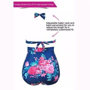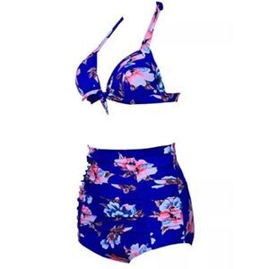 Blue bikini Floral High Waist Halter Swimsuit bathing suit retro L 1X 2X