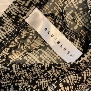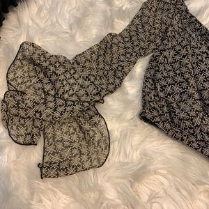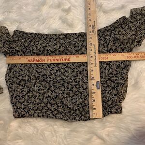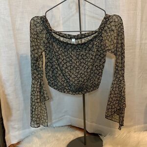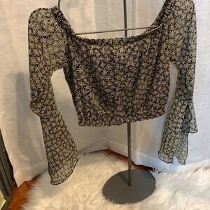 Blueblush Size medium crop top with bell sleeves. The bag is sheer but the front has black lining. The color is black and cream with gold stitching throughout. Can be worn on or off the shoulders. Like new condition and smoke free/pet free home