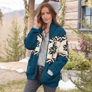 Stay cozy and stylish with this blue/green and cream fleece-lined cardigan sweater. Perfect for layering, this sweater adds a touch of elegance to any outfit