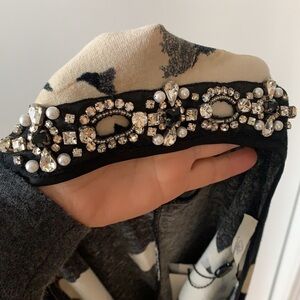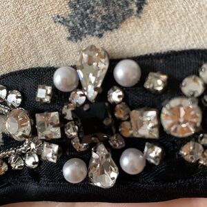 Stretchy rayon spandex fabric with silk neckline trim and crystal and pearls embellishments on the shoulders