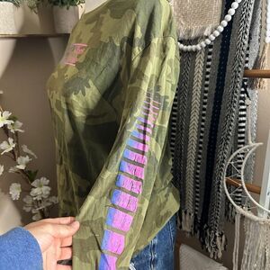 In good pre-loved condition. Cute and cozy camo print with graphic on the front and back. The graphic on the sleeves is peeling as shown but it’s still a super cute and comfy top! There is also a teeny hole in front and near under arm - not noticeable but could cut and make a crop top if you wanted, too! Has relaxed fit. Size large