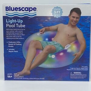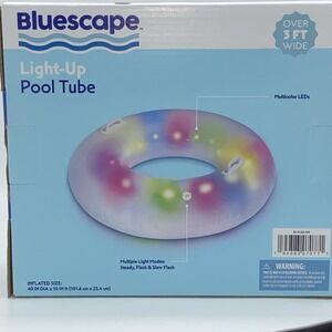 The Bluescape LED Pool Tube is an inflatable floating ring that lights up with a multicolor LED design. This energy-efficient pool toy is designed in the shape of a ring and is 40 inches in diameter. Perfect for outdoor activities, this Bluescape product adds a fun and vibrant touch to any pool or water setting. For ages 14+. Max weight 220 pounds.