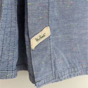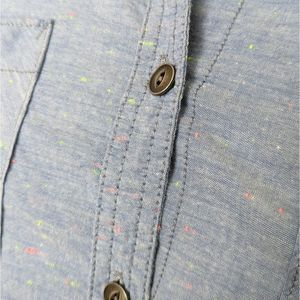 Adorable preppy blue chambray shirt speckled with neon yellow and Pink.