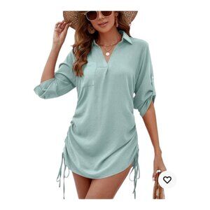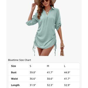 The Bluetime Women's Bathing Suit Cover Up is a stylish and comfortable option for women looking to cover up at the beach or pool. This v-neck cover up features 3/4 sleeves and is made of lightweight 100% polyester material, making it breathable and easy to wear on hot days. The purple color adds a fun pop to your swimwear ensemble, while the drawstring and sheer details add a touch of flair. Machine washable for easy care, this cover up is a must-have for any woman's wardrobe.
