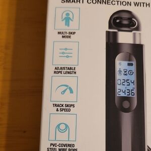 Smart jump rope with Bluetooth connectivity and digital display. Features a sleek black design.