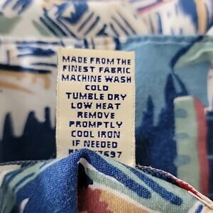 This shirt is one of our favorite thrifted finds being that we are born and raised in California. This vintage Hawaiian button-up shirt from Bluewater Wear showcases the many beautiful areas of the Golden State. Made from a soft and flowy cotton and rayon blend fabric. Features one chest pocket and small side hem slits. Pre-owned with signs of wear and fade. No visible stains or holes. There is one button missing but the extra button on the interior seam is still there (yay!) so a little handy work with a needle and thread is required. Made in USA. In men's size Large. California forever, good bye!