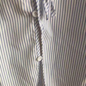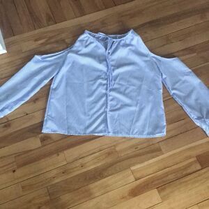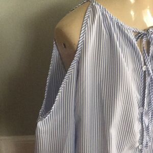 Blue and white stripe cold shoulder blouse. Sleeve is open to narrow band at neckline that turns into a center front tie. Front with button/elastic loop closure. Sleeves are long with button cuff. Gathered neckline. Cotton/ polyester blend. No brand or size tags but fits like a medium. New, no tags. Nonsmoking home.