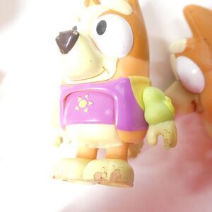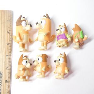 Lot of 7 Bluey figures of Chilli (mom) and Bingo (sister). They are 2-3 inches tall. Good shape overall with some play wear as shown. One has some chew marks/damage.