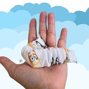 Delight in the playful charm of our handmade scrunchie series, featuring the beloved character Bluey on soft cotton fabric. Each scrunchie is meticulously crafted to order, ensuring precise attention to detail and a comfortable fit for your wrist.