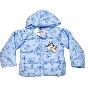 Introducing a Bluey & Bingo Print Puffer Jacket in toddler size 3T. This blue winter jacket features a full front zipper and an all-over print of the beloved characters Bluey and Bingo. Perfect for snow and cold weather. This item is brand new.