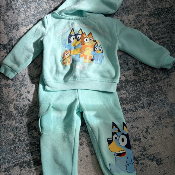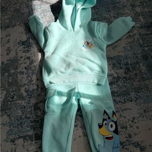 Adorable aqua hoodie and pants set featuring cartoon characters. Perfect for kids. Bluey Lot price is for all