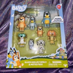 Sold out!! New in box !! Bluey Heeler Family and Mates Pack. 8 pack set including Bluey, Bingo, Chili(mum), Bandit (dad), Honey, Socks, Chloe, and Indy.