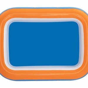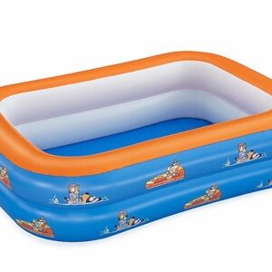 Official Bluey family pool inflatable. Bright blue body with orange top rim and white inner ring. Fun character print along sides. Great for kids 3+. Easy to inflate and display.