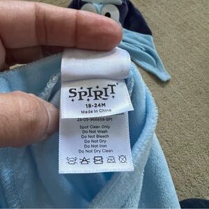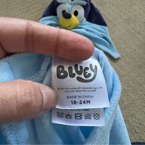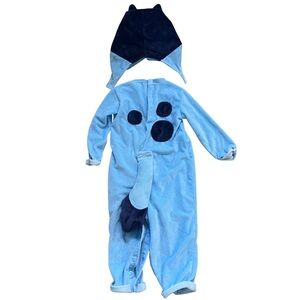 Adorable bluey costume. Includes jumpsuit, tail and hood. Perfect for Halloween fun. My son wore it at 22 months old and it had plenty of room still.