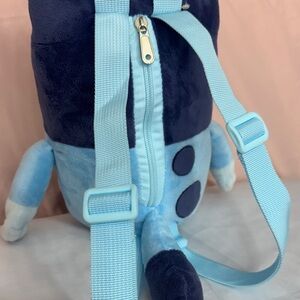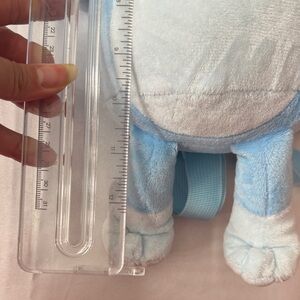 SMALL Bluey backpack… the size of a ruler. Has zipper in back but barely fits anything inside. Mostly for plush. Can maybe fit a small hot wheels car or something like that. Great condition. No tears.